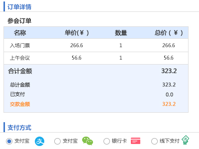 会腾软件票务及支付系统支持线上、线下多渠道付款。线上可以接受支付宝、微信等时下流行的支付方式以及线下参会人直接在会议现场进行刷卡、现金等普通支付,此外还支持信用卡支付项目,全方位适应参会人付费习惯